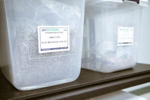 Seeds are kept in their original containers unless the containers are damaged or unable to be cleaned. Commonly used containers, like melamine or woven poly bags, are cleaned before opening to prevent contamination. Flexible packaging can also be stored in sanitized, sealable plastic totes to ensure seed retention and avoid cross-contamination.