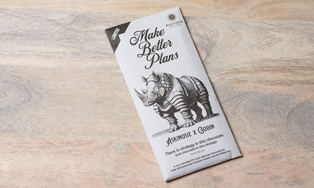 Ethical cocoa sourcing is important to Godin, so he partnered with Askinosie to create the chocolate bar, which features cocoa beans from Tanzania, Ecuador and the Philippines.